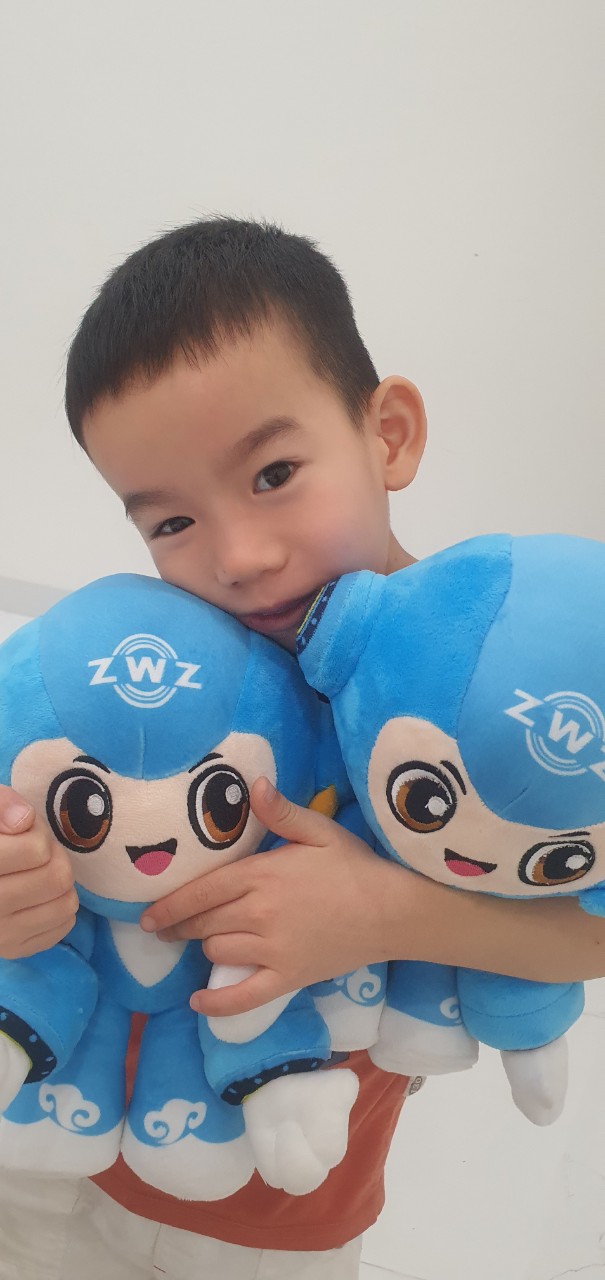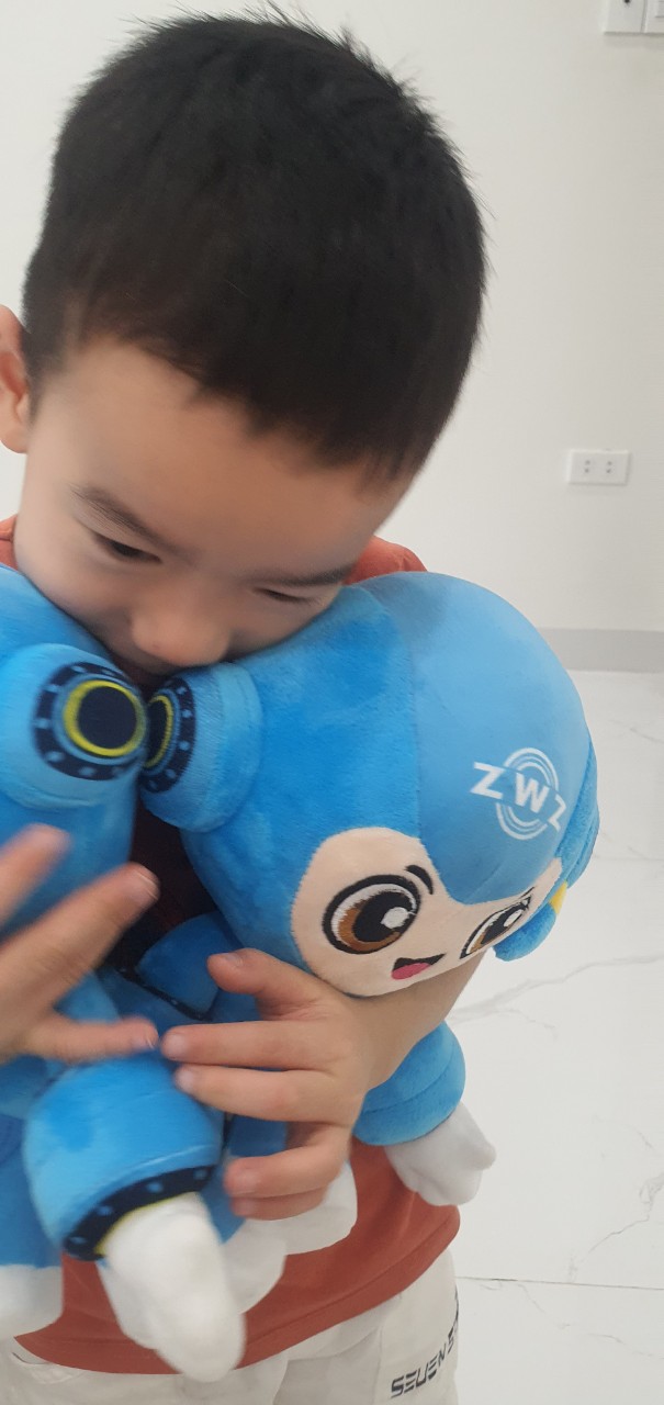 Các bé nhà Khang Ninh đều rất thích em gấu bông xinh xinh này. Đi chơi cũng ôm theo, đi ngủ cũng ôm theo. Rồi bắt đầu chương trình 10 vạn câu hỏi vì sao như: Linh vật là gì? Số 1938 là sao? Hai tay linh vật đeo vòng bi phải ko ạ?.... blabla