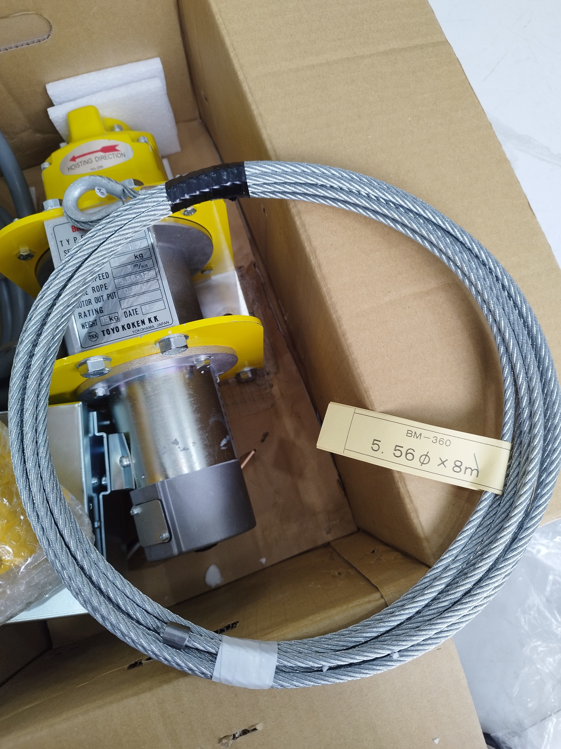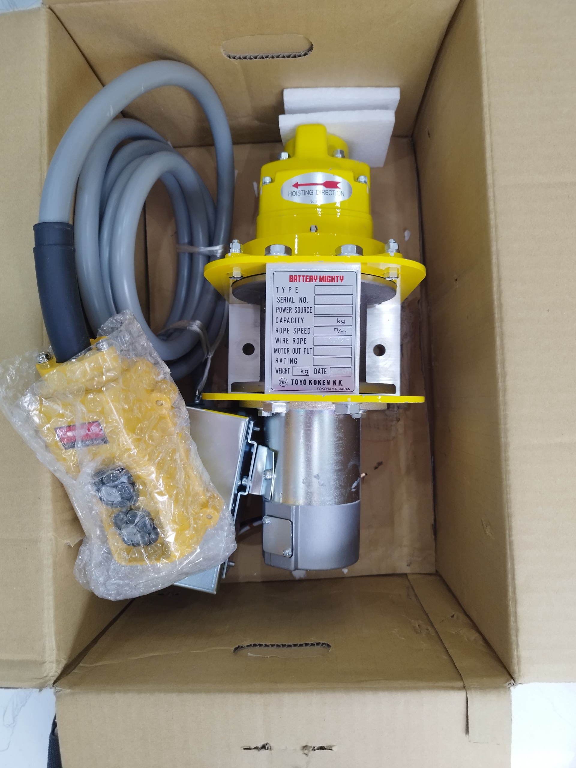 Tời điện BM-360, điện áp DC 12V, 300W, 35A, sức tải 450kg, dùng để nâng hạ di chuyển hàng hóa khối lượng lớn, thương hiệu Toyokoken... Khang Ninh cung cấp cho Nhà máy của Nhật, chuyên sản xuất phụ kiện cho Toyota.